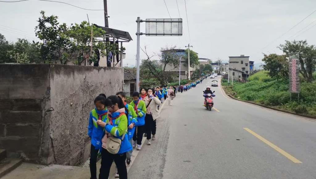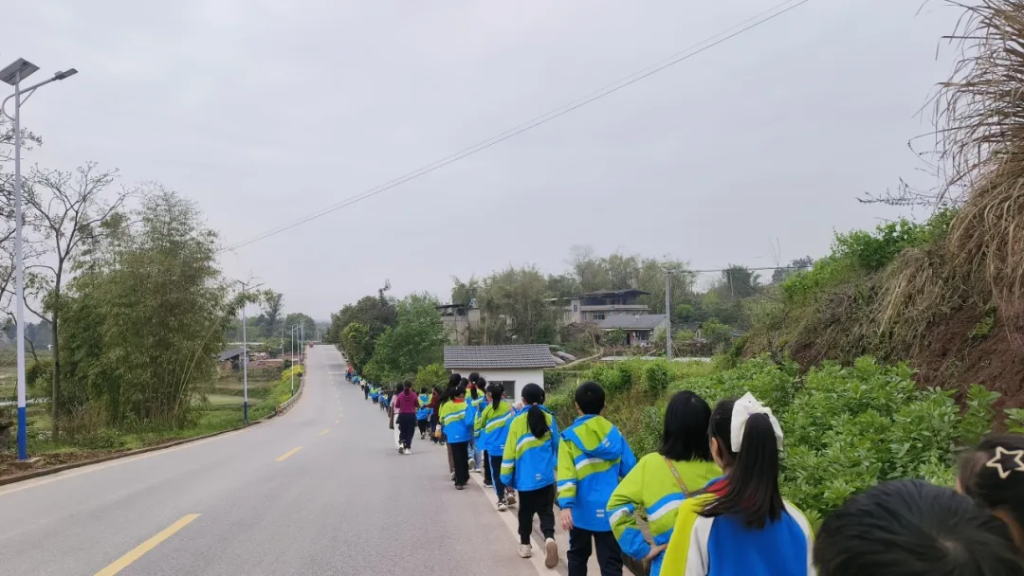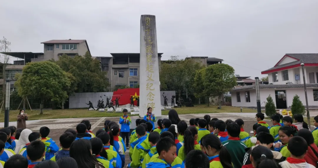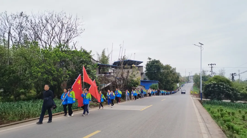 全体师生在李亮书记的带领下向着目的地进发。一路上,队伍整齐有序,步调一致。师生用时1小时10分,徒步大约4.6公里。到达座落在钱塘镇金子沱社区的金子沱武装起义纪念园。